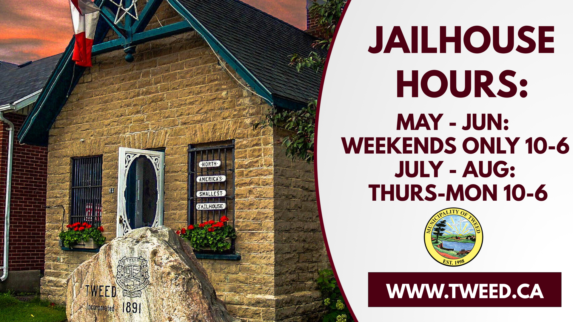 Tweed Jailhouse The Tweed Jailhouse was built in 1898, three years before the official incorporation of the town. It was operated as a jail until 1950. The jailhouse is now open on weekends for the month of May, 9-5 days and is used as a Visitor Information Centre. Located in the heart of the Village of Tweed stop in get your picture taken in jail and get some information about all the great things happening in our area this summer!